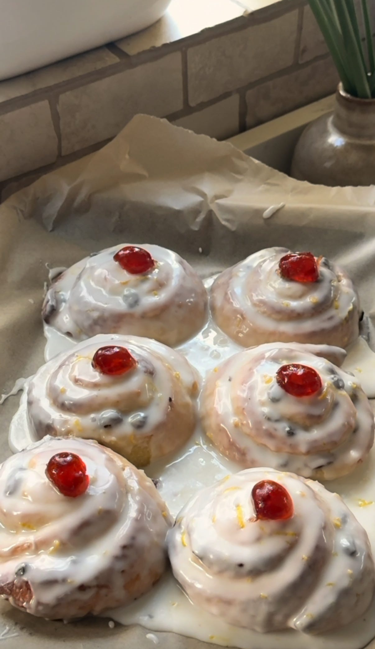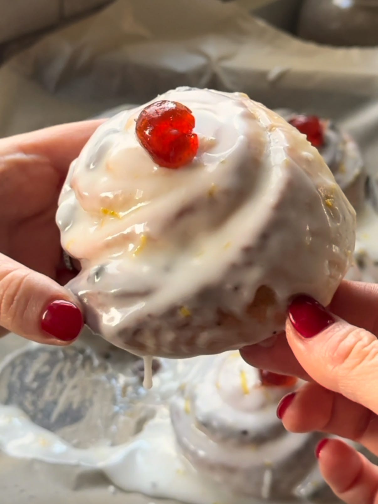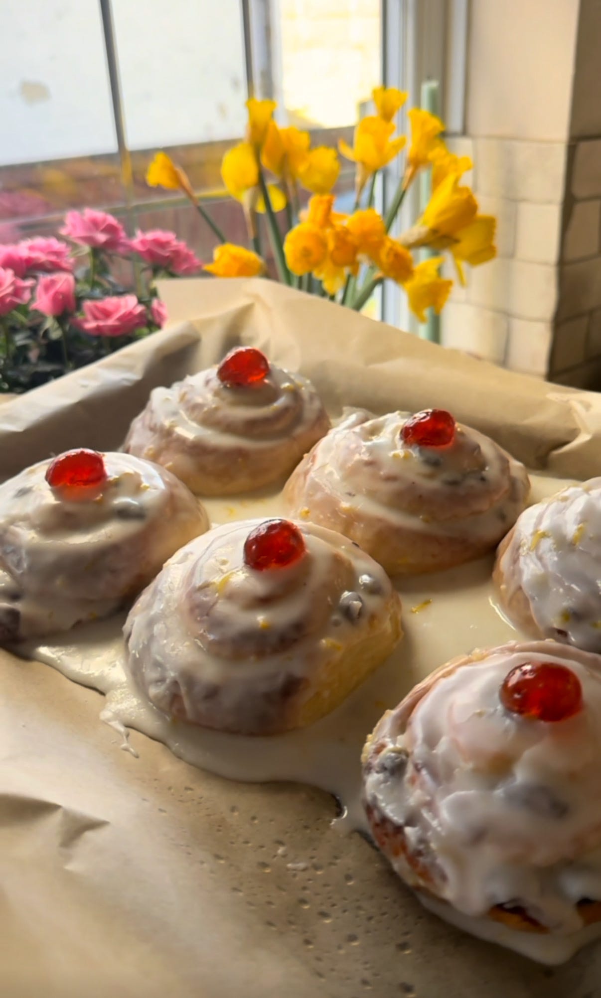 Spoon generously over each bun and top with a glacé cherry 🍒 enjoy ☺️